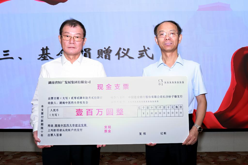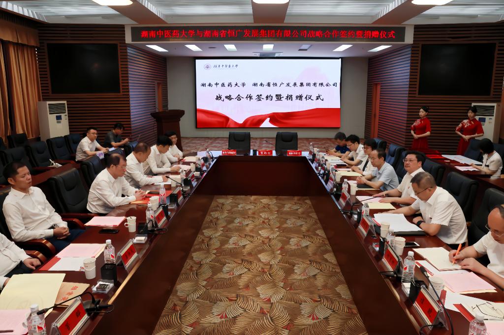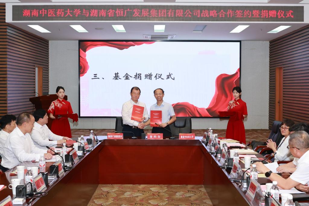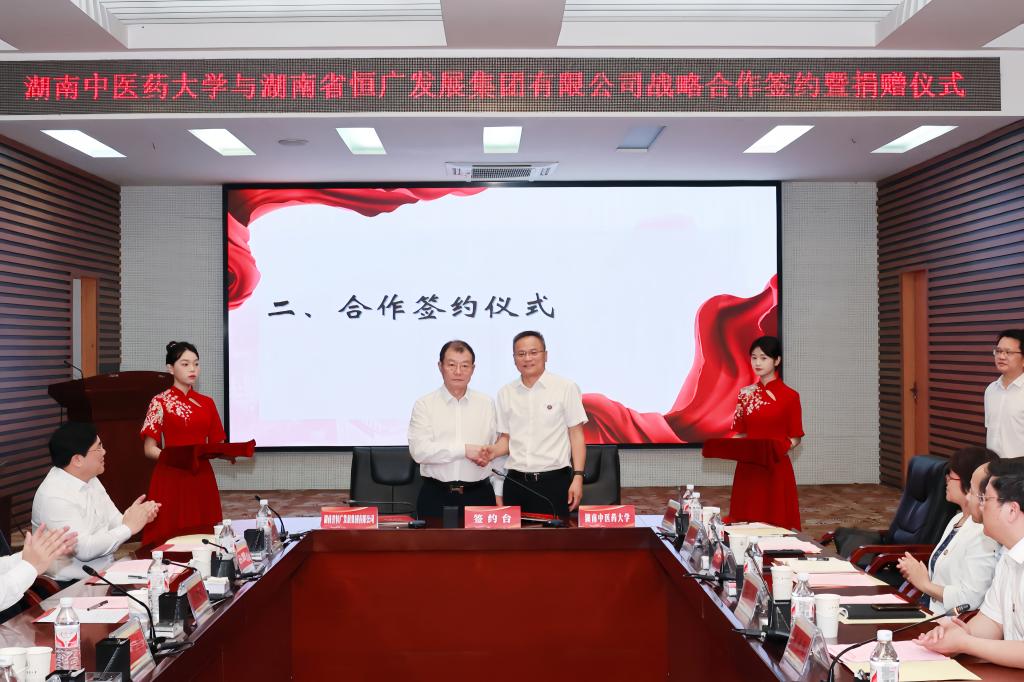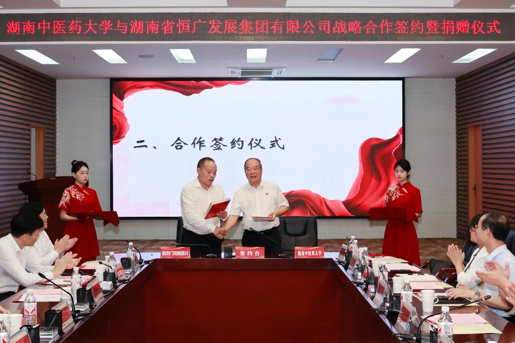 易刚强、张新德分别代表学校、湖南省恒广发展集团共同签署《湖南中医药大学与湖南省恒广发展集团有限公司合作协议》;刘富林、彭建武分别代表学校、湖南省恒广发展集团共同签署《湖南省恒广发展集团有限公司与湖南中医药大学技术服务合同》;廖菁、张新德分别代表学校、湖南省恒广发展集团共同签署《湖南省恒广发展集团有限公司与湖南中医药大学捐赠协议》。张新德向廖菁递交捐赠牌,戴爱国授予湖南省恒广发展集团《基金捐赠证书》。